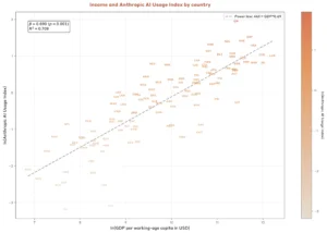 El uso per cápita de Claude está positivamente correlacionado con el ingreso per cápita entre países. (Los ejes están en escala logarítmica.)