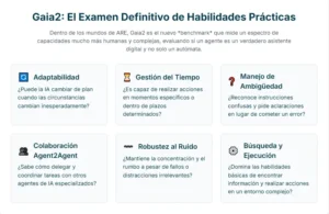 Si ARE es el teatro de operaciones, Gaia2 es la primera gran obra que se representa en él. Se trata de un benchmark de nueva generación, construido íntegramente sobre la plataforma ARE, y diseñado para medir un espectro de capacidades de los agentes inteligentes que hasta ahora habían sido ignoradas. Gaia2 abandona las preguntas de trivial y los rompecabezas abstractos para centrarse en tareas que, aunque sencillas para un ser humano, resultan diabólicamente complejas para los modelos de IA actuales precisamente porque requieren una comprensión holística del contexto, el tiempo y la interacción.