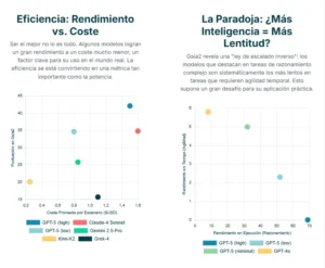 Esta tensión nos lleva directamente a otra de las grandes lecciones del estudio: la importancia de evaluar los sistemas no solo por su rendimiento bruto, sino también en función de su eficiencia y coste. En el mundo real, las soluciones no solo tienen que ser correctas, sino también viables económicamente. Los gráficos de los resultados muestran claramente que existe un complejo equilibrio entre la puntuación obtenida, el coste computacional (medido en dólares por escenario) y el tiempo de resolución. Algunos modelos ofrecen un rendimiento excelente pero a un coste prohibitivo, mientras que otros, aunque ligeramente menos capaces, son mucho más eficientes. Esta perspectiva, que normaliza el rendimiento en función de los recursos consumidos, cambiará la forma en que la industria juzga el valor de un modelo. El objetivo ya no es solo construir el sistema más potente, sino el que ofrece el mejor rendimiento por cada dólar invertido o cada vatio consumido.