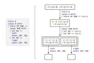 Una demostración formal de una dirección de la distributividad de AND sobre OR, junto con una realización como parte de un hiperárbol de búsqueda. Los bordes del árbol despliegan la demostración como una serie de acciones, mientras que sus nodos registran la evolución del estado Lean. La táctica del segundo caso conduce a dos estados separados que se resuelven de forma independiente. Las hojas vacías indican que no quedan objetivos, por lo que la afirmación raíz está probada.