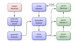 El teorema objetivo (rojo) se procesa mediante una secuencia de consultas en lenguaje natural (azul), lo que genera una serie de lemas que son procesados por el algoritmo de búsqueda (verde). Si el teorema permanece sin demostrar, se revisan los lemas no demostrados y se repite el procedimiento.