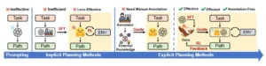 Planificación tradicional de agentes vs. planificación de agentes con nuestro planificador EAGLET. De esta forma, los agentes ejecutores pueden completar mejor las tareas con menos interacciones.