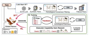 El proceso general de EAGLET, que incluye (1) SFT de inicio en frío: Sintetizamos planes globales de alta calidad mediante el método de filtrado por consenso homólogo para la etapa de SFT. (2) Entrenamiento de aprendizaje automático (RL): Refinamos aún más el planificador mediante un enfoque de aprendizaje automático basado en reglas con la recompensa de ganancia de capacidad del ejecutor diseñada.