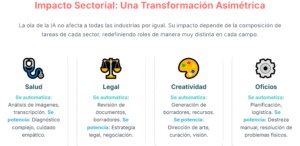 Esta transición, sin embargo, está lejos de ser homogénea, lineal o indolora. Su ritmo es asimétrico y su impacto, desigual. Genera ganadores y perdedores a una velocidad que desafía la capacidad de adaptación de nuestras instituciones sociales, educativas y políticas. Mientras algunos sectores y profesionales experimentan un crecimiento exponencial en productividad y eficiencia, otros ven cómo ocupaciones enteras, especialmente aquellas basadas en rutinas cognitivas predecibles y en la intermediación de información, se vuelven vulnerables.