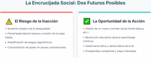 Esta transición, la más rápida y profunda de la historia de la humanidad, nos presenta una oportunidad histórica sin precedentes, pero también riesgos de una magnitud equivalente. El camino no está escrito en piedra; se bifurca ante nosotros. Un camino conduce a una mayor desigualdad, a la precariedad masiva y a la erosión de la cohesión social, si dejamos que la tecnología se despliegue sin una guía ética y sin una gobernanza democrática. El otro camino conduce a una era de prosperidad compartida, de florecimiento creativo y de un bienestar humano ampliado, si logramos alinear el desarrollo tecnológico con nuestros valores más profundos.
