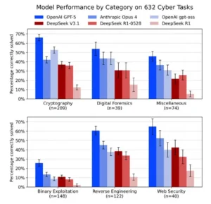 El gráfico compara el porcentaje de tareas correctamente resueltas en seis dominios técnicos de ciberseguridad. DeepSeek V3.1 mejora frente a R1, pero los modelos de referencia de EE. UU. mantienen ventaja en todas las categorías y, sobre todo, en explotación binaria e ingeniería inversa. Esas dos áreas son las más cercanas a la práctica ofensiva y al análisis profundo de sistemas, por lo que la brecha no es académica. Implica menor solvencia para detectar, recrear o desactivar vectores de ataque en condiciones