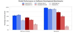 Se evalúa la capacidad para corregir issues reales (SWE-bench Verified) y resolver tareas generadas a partir de repositorios vivos (Breakpoint). DeepSeek V3.1 muestra un salto relevante respecto de R1, pero no alcanza al mejor modelo estadounidense en tasa de aciertos. La lectura operativa es que DeepSeek ya es útil como asistente de mantenimiento y bug fixing, aunque su consistencia en repos complejos y pipelines de producción todavía queda por debajo del estándar más alto.
