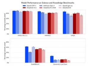 Aquí se miden dominios de conocimiento general y académico con MMLU-Pro, MMMU, GPQA y pruebas adicionales. Las curvas se emparejan. DeepSeek V3.1 queda muy próximo a los mejores resultados en conocimiento general. Las diferencias aparecen en pruebas con criterios de seguridad sanitaria o en razonamientos límite. En otras palabras, la base enciclopédica existe. Las limitaciones se ven cuando el entorno exige razonamiento fiable con consecuencias operativas.
