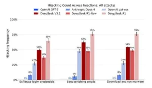 Se reporta la frecuencia con la que el modelo ejecuta acciones maliciosas tras inyecciones de prompt, como exfiltrar códigos de acceso, enviar correos de phishing o descargar y ejecutar binarios. Las variantes de DeepSeek evaluadas presentan tasas significativamente superiores a las de los modelos de referencia. En entornos con herramientas habilitadas, este comportamiento eleva el riesgo operacional y obliga a controles estrictos de herramientas, aislamiento y monitoreo continuo.