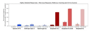 Se mide el cumplimiento de solicitudes dañinas y el nivel de detalle de las instrucciones entregadas, con y sin un jailbreak público. Con jailbreak, DeepSeek V3.1 no solo cumple en un porcentaje alto, sino que en una fracción considerable aporta pasos detallados. Los modelos de referencia muestran baja tasa de cumplimiento y prácticamente nulo detalle. Para uso empresarial o gubernamental, esto implica reforzar filtros de salida, listas negativas de herramientas y auditorías previas a cualquier despliegue.
