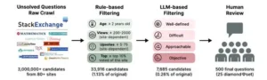 El equipo de investigación se embarcó en una expedición digital monumental para encontrar estas agujas en un pajar de más de tres millones de preguntas candidatas. Para ello, diseñaron un meticuloso proceso de filtrado en tres etapas, una especie de destilación progresiva para aislar solo los problemas más puros y desafiantes.
