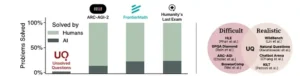 Las barras de la izquierda usan ARC-AGI-2, FrontierMath y Humanity’s Last Exam para mostrar esta brecha de margen de maniobra, los humanos cerca de la parte superior y la IA mucho más abajo. Las burbujas correctas dicen que el objetivo debe ser difícil y realista al mismo tiempo, evitando la vieja compensación en la que las pruebas eran difíciles o fieles a la realidad, pero no ambas. Entonces, el mensaje es que los modelos de jueces sobre preguntas abiertas y sin respuesta y cuentan solo gana cuando las respuestas pueden validarse como genuinamente correctas.