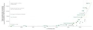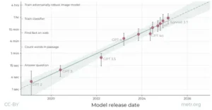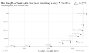 Este gráfico demuestra que la capacidad de la inteligencia artificial para completar tareas autónomas ha crecido exponencialmente, duplicando la complejidad de las tareas que puede resolver aproximadamente cada siete meses desde 2019.