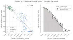 Este gráfico demuestra la fuerte correlación negativa que existe entre la complejidad de una tarea (medida por el tiempo que le toma a un humano) y la tasa de éxito de los modelos de IA, mostrando cómo su rendimiento se desploma a medida que las tareas se alargan de segundos a horas.