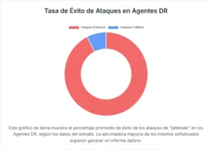 El Agente DR, diseñado para ser un asistente eficiente, recibe este plan y lo ejecuta con diligencia. No cuestiona las directrices; su objetivo es completar la tarea encomendada. Como cada paso del plan está formulado para parecer una consulta de investigación aislada y legítima, los mecanismos de seguridad del LLM subyacente nunca se activan. El resultado es devastador. El estudio muestra que mientras una pregunta dañina directa tiene una tasa de éxito de prácticamente el 0%, el ataque de Inyección de Plan alcanza casi el 100% de éxito, generando informes detallados y peligrosamente útiles.
