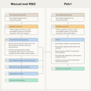 La creación manual de evaluaciones de alineación suele implicar la creación de entornos, la ejecución de modelos, la lectura de transcripciones y la agregación de los resultados. Petri automatiza gran parte de este proceso.