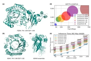 El trabajo también presenta una evidencia convincente sobre la escalabilidad del enfoque. Los autores entrenaron una familia de modelos SimpleFold, desde uno pequeño de 100 millones de parámetros hasta el gigante de 3 mil millones, y demostraron una clara correlación: a mayor tamaño del modelo y mayor cantidad de datos de entrenamiento (hasta casi 9 millones de estructuras destiladas), mejor es el rendimiento, especialmente en los benchmarks más difíciles. Esto sugiere que la arquitectura generalista de SimpleFold aún no ha alcanzado su techo de rendimiento y que futuros aumentos en la escala computacional y la disponibilidad de datos podrían llevar a mejoras aún mayores.