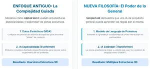 La presentación de SimpleFold es mucho más que el anuncio de un nuevo modelo de predicción de proteínas. Es el heraldo de un cambio de paradigma en la forma en que la inteligencia artificial aborda los problemas científicos complejos. Representa una transición desde un enfoque de «conocimiento codificado» hacia uno de «aprendizaje emergente». La primera revolución, liderada por AlphaFold2, demostró que se podía resolver un gran desafío científico diseñando intrincadamente una IA para que pensara como un biólogo evolutivo. Esta segunda revolución, iniciada por SimpleFold, sugiere que una arquitectura de aprendizaje lo suficientemente general y potente, alimentada con una cantidad masiva de datos, puede aprender por sí misma las reglas fundamentales de la física y la biología que gobiernan el plegamiento de proteínas, sin necesidad de que se le enseñen explícitamente.