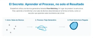 La analogía más poderosa y accesible para entender este enfoque proviene del mundo de la IA generativa de imágenes. Modelos como DALL-E o Midjourney han cautivado al mundo con su capacidad para crear imágenes fotorrealistas a partir de una simple descripción de texto. El usuario proporciona un «prompt», como «un astronauta montando a caballo en la luna al estilo de Van Gogh», y el modelo genera una imagen que corresponde a esa descripción. SimpleFold opera bajo un principio conceptualmente idéntico. La secuencia de aminoácidos de una proteína actúa como el «prompt», y el modelo genera el resultado deseado: la estructura tridimensional completa de todos sus átomos en el espacio.